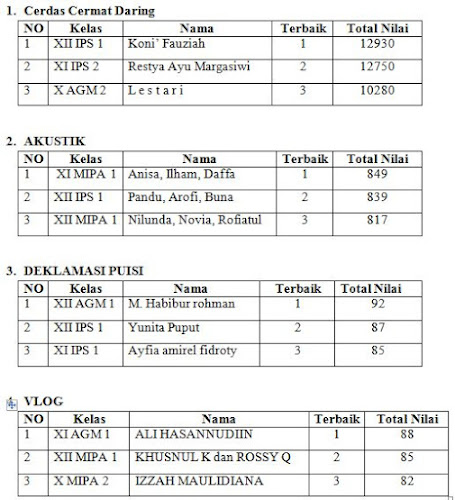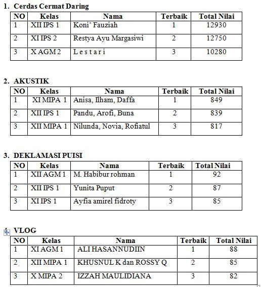 MAN 2 Nganjuk – MAN 2 Nganjuk menyelenggarakan beberapa jenis lomba secara daring dalam rangka peringatan HUT RI ke-75. Hal itu terkait dengan upaya pencegahan COVID-19. Jenis lombanya yakni, cerdas cermat daring, akustik, deklamasi puisi, dan vlog. Ke empat lomba tersebut dilaksanakan sejak akhir Agustus 2020. Setiap kelas mengirimkan perwakilan peserta untuk semua lomba. Setiap peserta mengirimkan video melalui link yang dibagikan panitia.