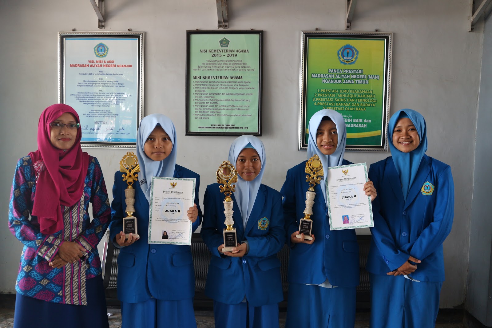 Juara II Cerdas Cermat Quran (CCQ) tingkat Kab. Nganjuk dalam rangka HUT RI ke-72. Dalam foto pembina (Miftahul Hidayah, S.Ag.) dengan Fabby Aisyatul M. (XI AGT); Alfina Nur Z (XI BCA); Fatikhatul Malikah (XII AGT).
