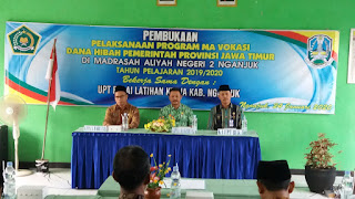 Pembukaan diikuti oleh Plt. Kepala MAN 2 Nganjuk, Kakankemenag Kab. Nganjuk, pengawas MA, ketua komite MAN 2 Nganjuk, Kepala BLK Kab. Nganjuk, 5 tutor serta panitia MA vokasi dari bapak ibu guru dan siswa/siswi kelas X. MA vokasi ini diikuti oleh 150 siswa/siswi kelas X. MA Vokasi dimulai 3 Pebruari 2020.