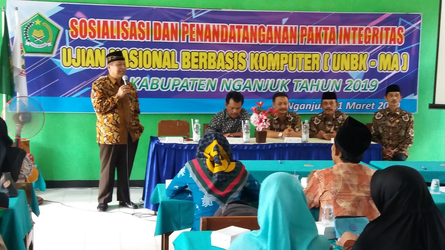 MAN 2 Nganjuk – Pengawas, proktor dan teknisi UNBK MA negeri dan swasta mengikuti sosialisasi dan penandatanganan pakta integritas UNBK MA 2019 di aula MAN 2 Nganjuk (21/3). Sosialisasi dan penandatanganan dihadiri juga oleh kepala madrasah se-Kab. Nganjuk, pengawas MA dan Kakankemenag Nganjuk.