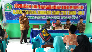 “Di sini hadir pengawas, proktor dan teknisi dari MA negeri dan swasta se-Kab. Nganjuk. Di samping itu, panjenengan semua juga menandatangani pakta integritas UNBK 2019. Dengan demikian, panjenengan semua dianggap memiliki integritas untuk menyelenggarakan UNBK 2019 dengan baik,” ucap Kakankemenag Nganjuk.