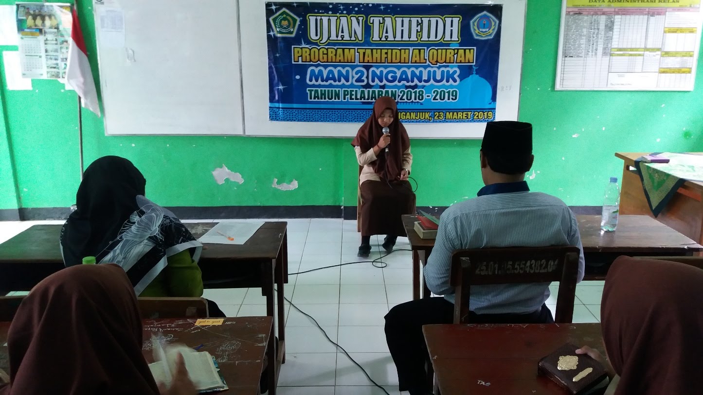 MAN 2 Nganjuk – Siswa/siswi kelas XII tahfidh mengikuti ujian tahfidh program tahfidh Al Qur’an MAN 2 Nganjuk (25/3). 32 siswa/siswi mengikuti ujian ini. Mereka terdiri atas 9 laki-laki dan 23 perempuan. Ujian tahun ini merupakan tahun ke 8. Program tahfidh Al Qur’an merupakan program unggulan di MAN 2 Nganjuk sejak tahun 2011.